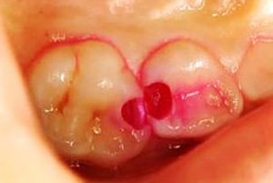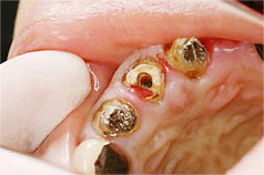 写真の様に、歯茎(歯肉)に埋まっている部分まで虫歯が進行した場合、普通なら抜歯になります。一方、エクストリュージョン法なら、歯肉に埋まっている歯を引っ張り出し、それを土台として被せ物を装着させることができます。自分の歯を残せますので予後は良くなるというメリットもあります。